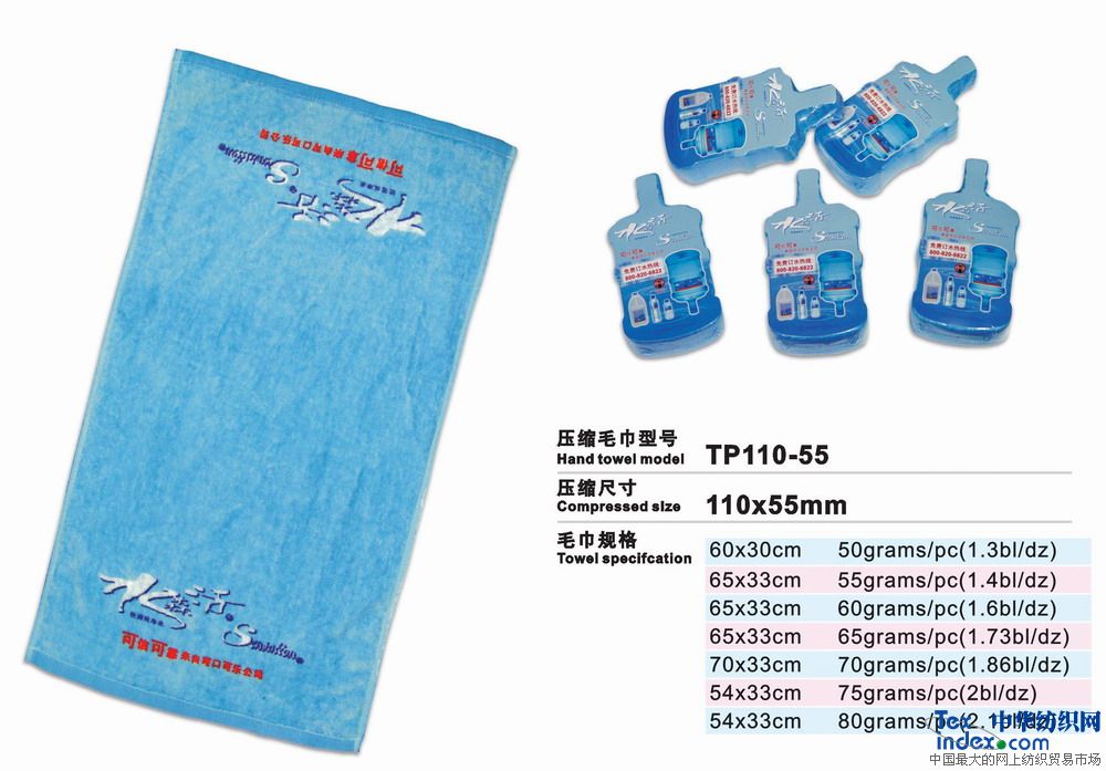 高級環保壓縮毛巾是二十一世紀的高科技成果、采用100%純棉經高溫壓處理而成的新一代產品。放入水中浸片刻即可張開使用。本產品新奇獨特,干凈衛生,產品企業形象宣傳極具效力。廣泛用于廣告宣傳界、酒店、旅游公司等。