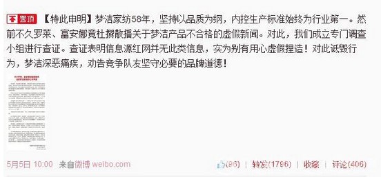 2014-5-6富安娜家紡就昨日夢(mèng)潔家紡官方發(fā)布會(huì)指責(zé)“富安娜家紡與羅萊家紡捏造假新聞詆毀”事件作出回應(yīng),并于官方微博與騰訊微信等平臺(tái)提出“嚴(yán)重聲明”表明自己的清白立場(chǎng),并欲追究相關(guān)責(zé)任。以下為富安娜官方微博聲明內(nèi)容:...[繼續(xù)閱讀] -